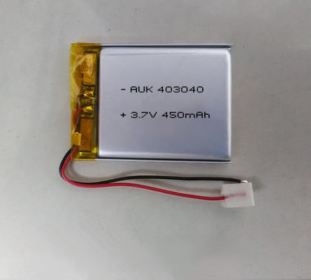 AUK 403040 Lithiumpolymerbatterijnominale spanning 3,7 V, laadspanning 4,2 V, nominale capaciteit 450 mAh;